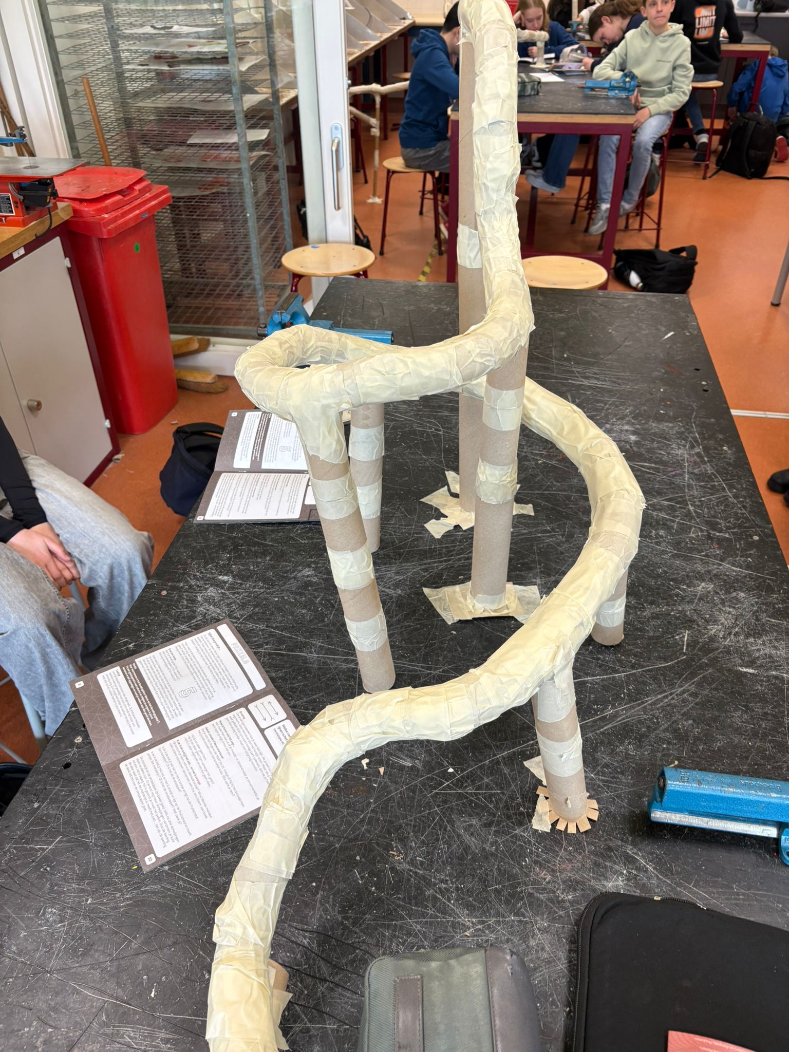 Op dinsdag 31 maart hebben de leerlingen van Gymnasium 2 het Athena-thema 'Achtbanen' afgesloten. In de voorgaande lessen verdiepten de leerlingen zich in alles wat bij achtbanen komt kijken. Ze maakten een mindmap en onderzochten wiskundige en natuurkundige aspecten, zoals krachten en snelheden, die ze in verschillende situaties berekenden. Daarna brachten de leerlingen een bezoek aan Vekoma in Vlodrop. Dit bedrijf, dat dit jaar honderd jaar bestaat, leerde hen alles over het proces van het maken van een achtbaan: van ontwerp tot uitvoering en controle. Ter afsluiting zijn de leerlingen zelf aan de slag gegaan om in groepjes hun eigen achtbanen te bouwen.