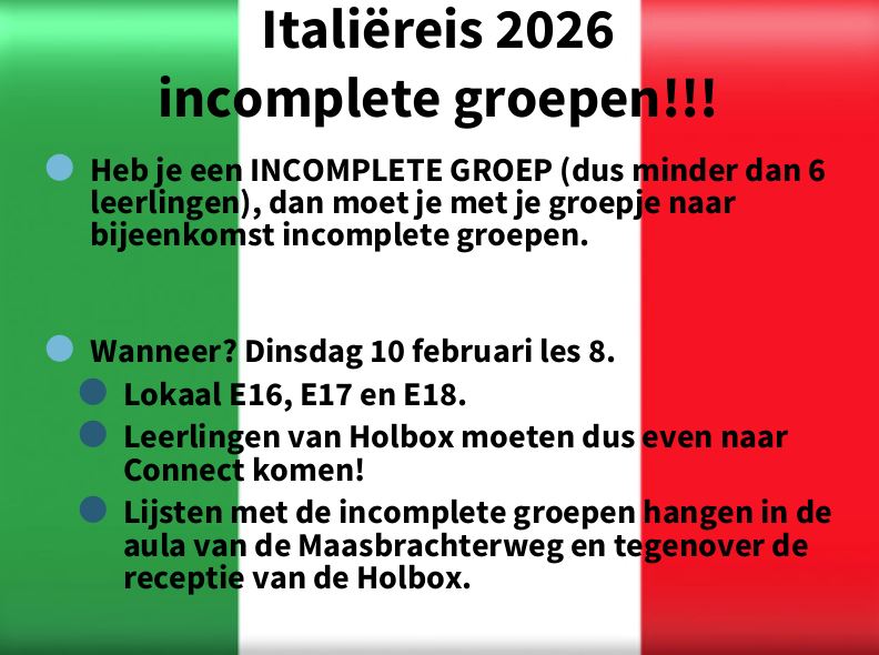 Dinsdag 10 Februari 8e uur (14:35): bijeenkomst Italie reis incomplete groepen. Lokalen E16, E17, E18!